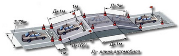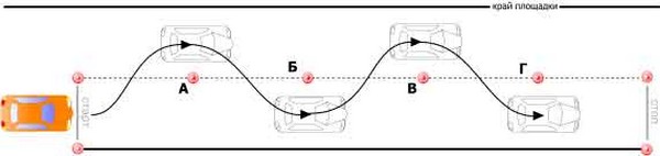 Занимаем исходную позицию у отметки "СТАРТ", включаем I передачу и начинаем движение. Достаточно интенсивно вращаем руль влево и как только правое колесо пересекло линию между стартовой фишкой и фишкой "А" начинаем вращать руль вправо стараясь выставить автомобиль параллельно линии фишек. Как только правое зеркало автомобиля поравнялось с фишкой "А", интенсивно вращаем руль вправо. При пересечении левым передним колесом воображаемой линии между фишками "А" и "Б" выравниваем траекторию движения параллельно линии фишек. Также минуем оставшиеся фишки и подъезжаем к отметке "СТОП". Выключаем сцепление, выключаем передачу (ставим в нейтральное положение), ставим на стояночный тормоз.