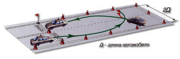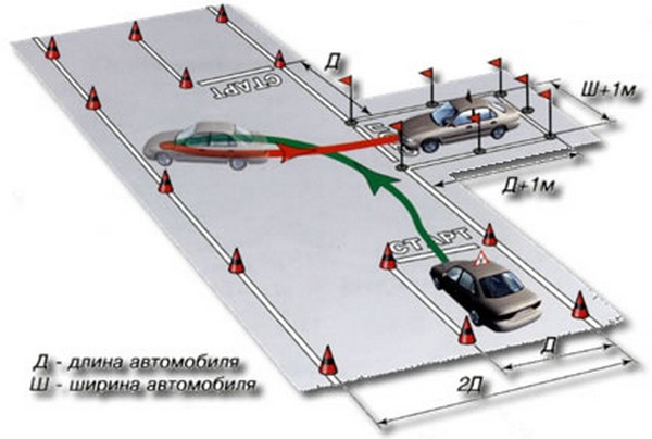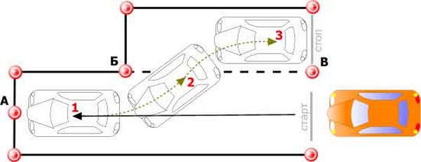 Занимаем исходную позицию у отметки "СТАРТ", включаем I передачу и проезжаем к фишке "А" так, чтобы переднее левое крыло автомобиля было с ней на одном уровне. Продолжая медленное движение, интенсивно вращаем руль вправо до упора и доезжаем как можно ближе к фишке "Б", останавливаемся у нее, вращаем руль влево. Включаем заднюю передачу и контролируя по зеркалам или повернувшись назад двигаемся задним ходом до линии, соединяющей фишки "А” и "В", останавливаемся у нее. Вращаем руль вправо, вновь включаем I передачу и доезжаем до отметки "СТОП". Выключаем сцепление, выключаем передачу (ставим в нейтральное положение), ставим на стояночный тормоз.